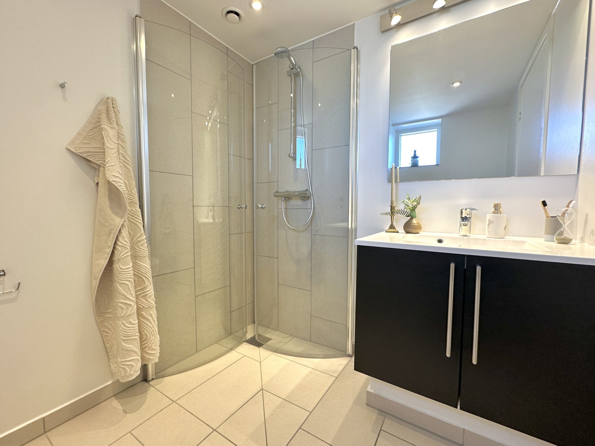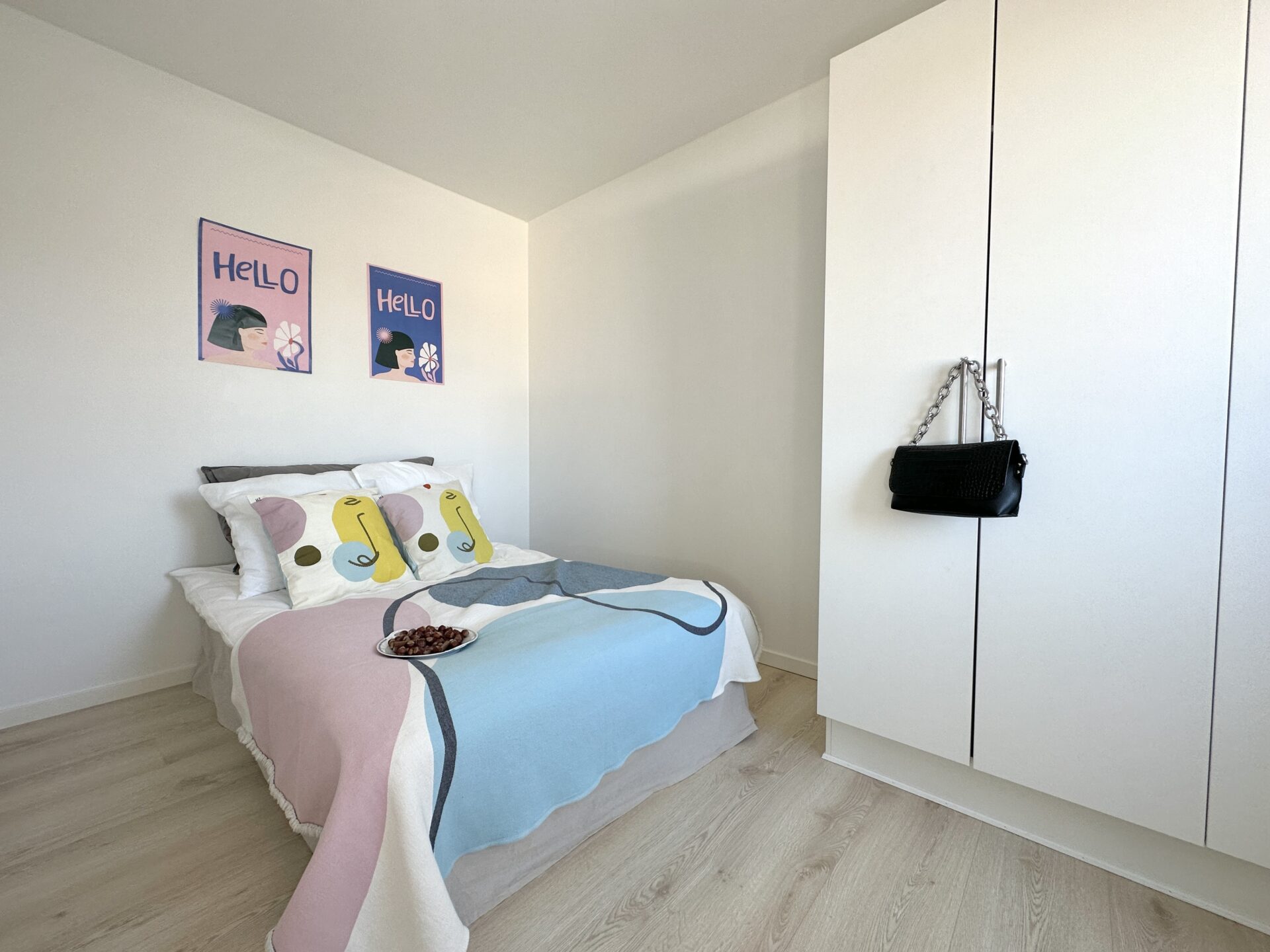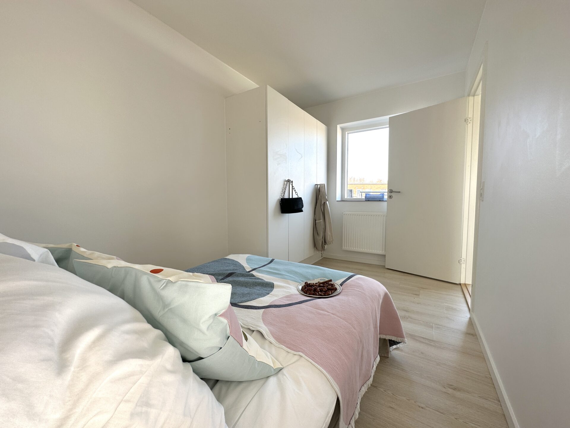 På soveværelset er der faste skabe og rigeligt med plads til alt jeres lækre tøj.