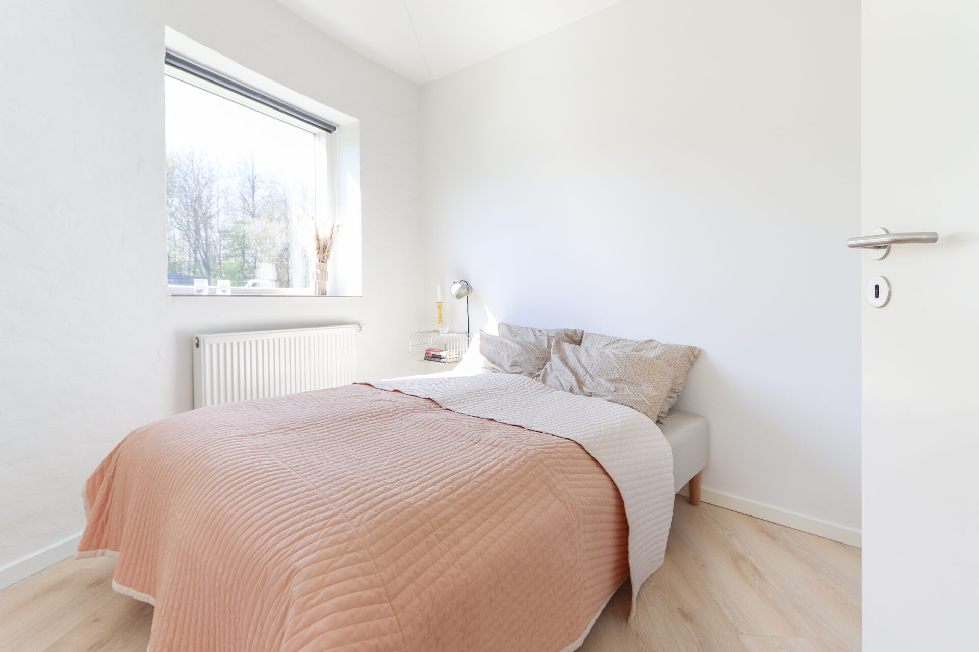 Stor køkken og stue, dejlig badeværelse og soveværelse med faste skabe.