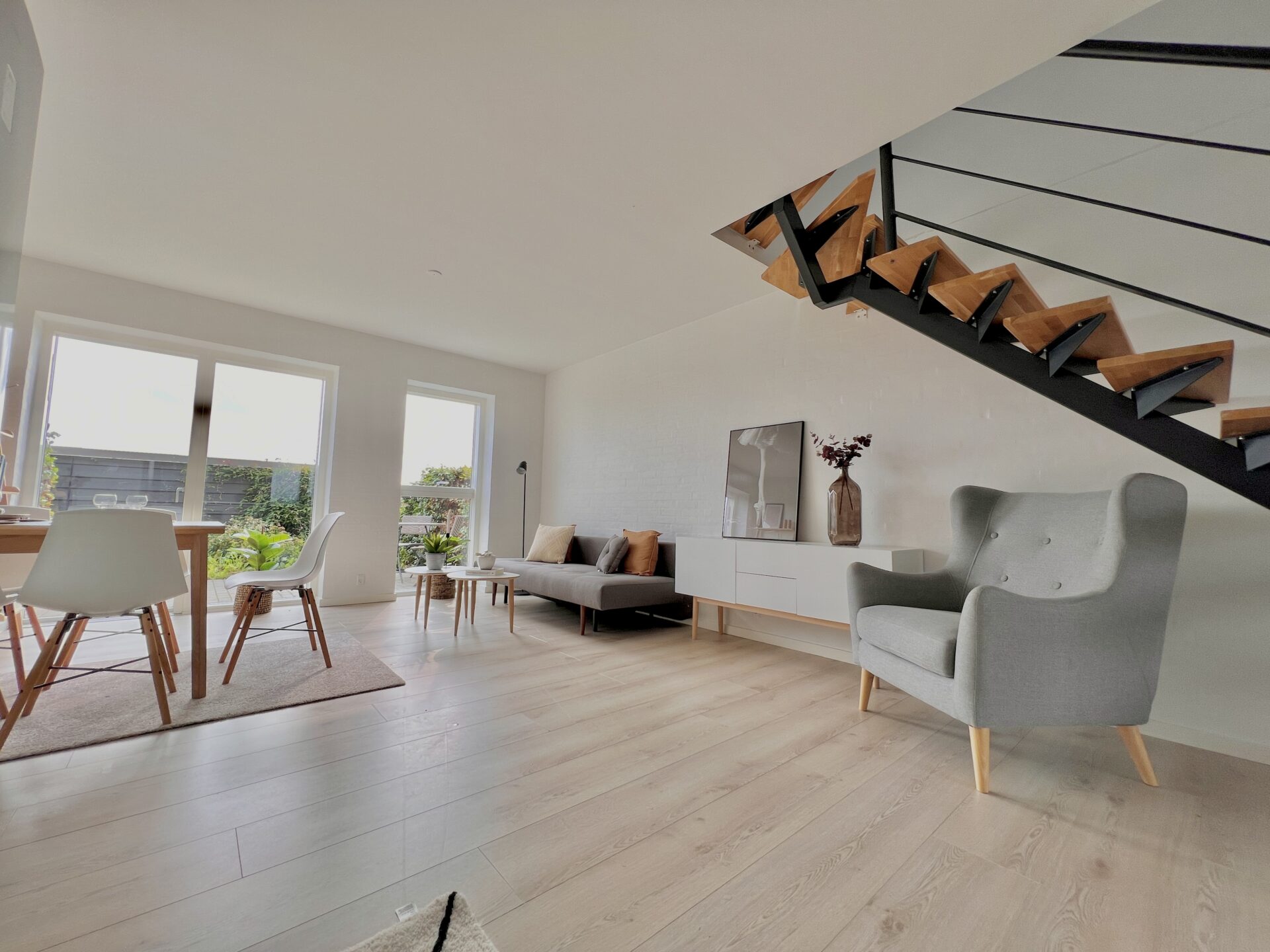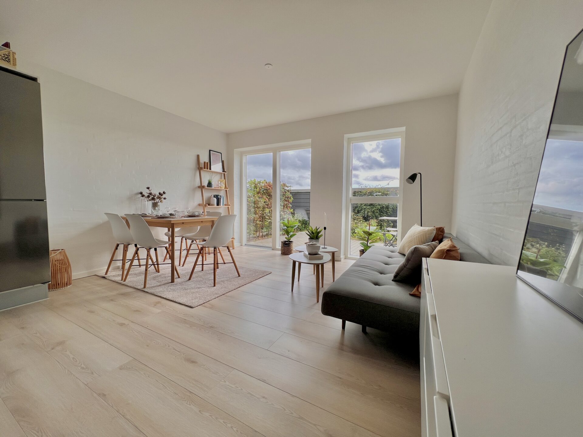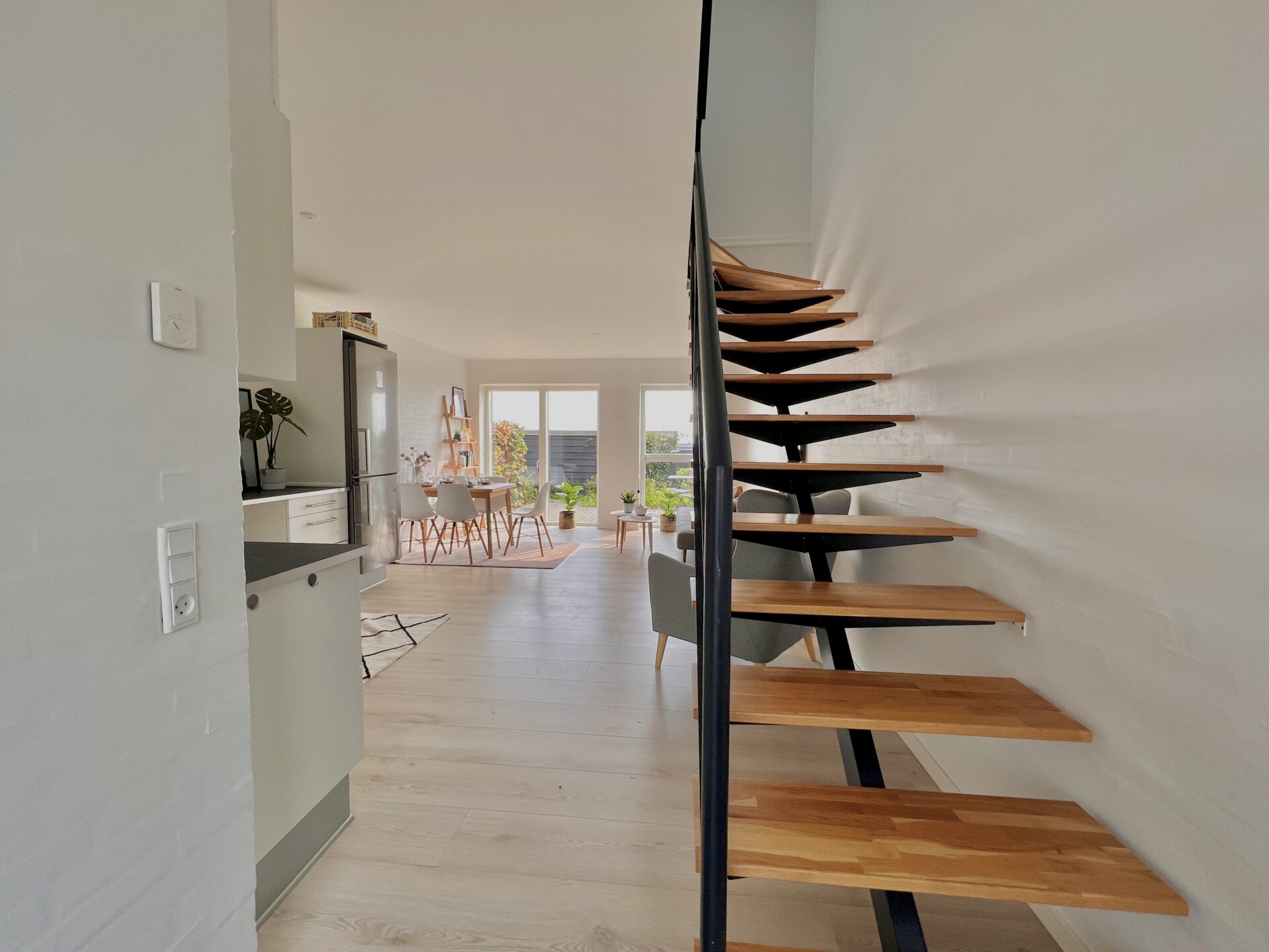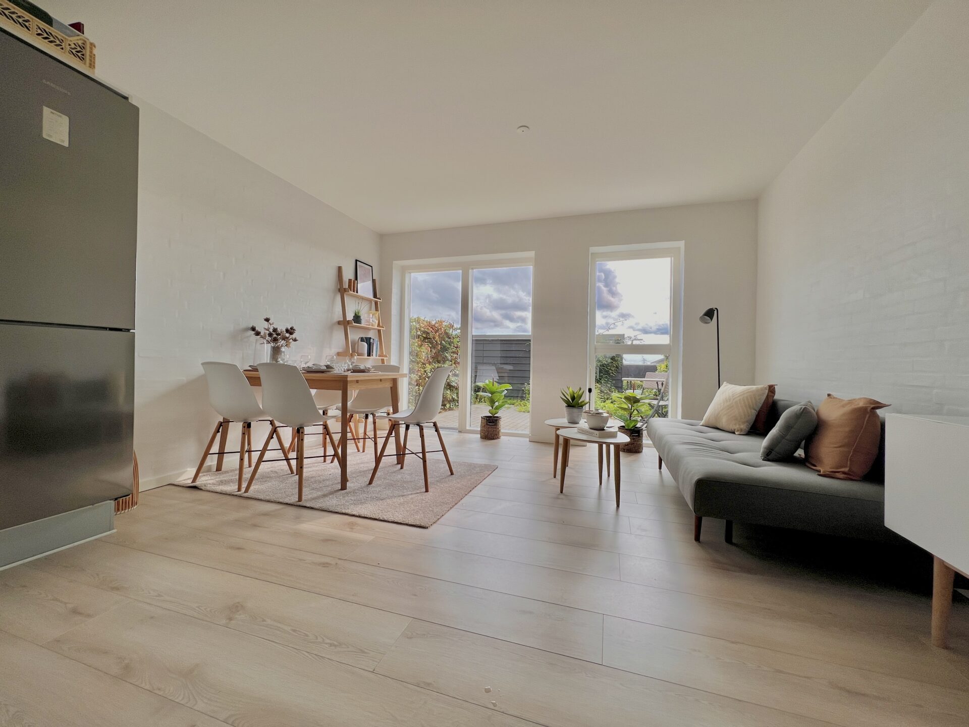 Vores lejligheder er alle 3-værelses lejligheder med lækkert køkken/alrum stue og badeværelse i stueplan og på førstesalen finder du et repos og to store værelser begge med garderobeskabe.