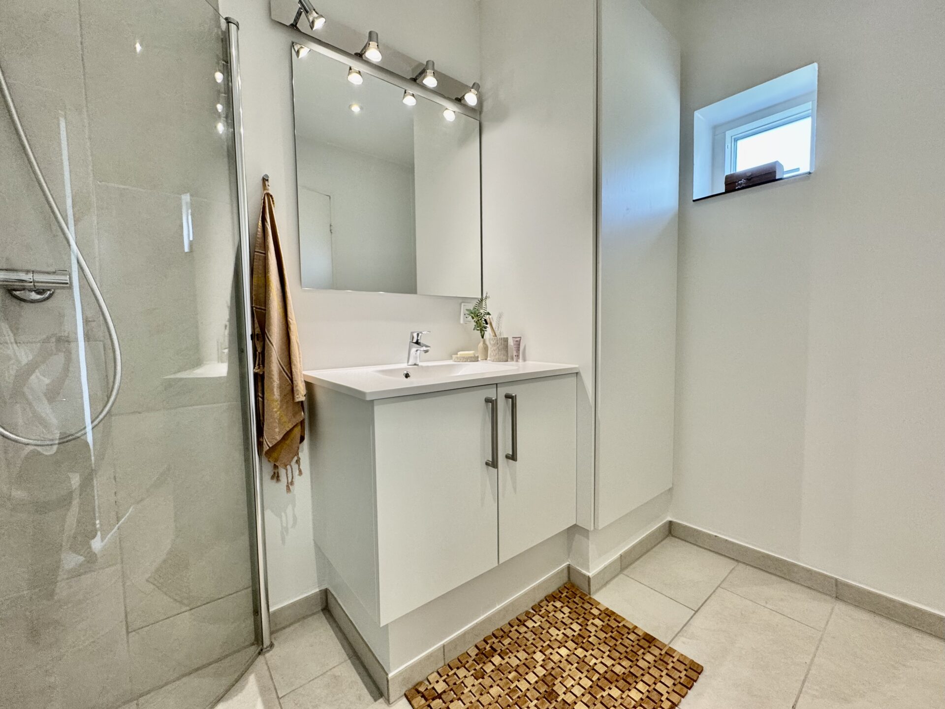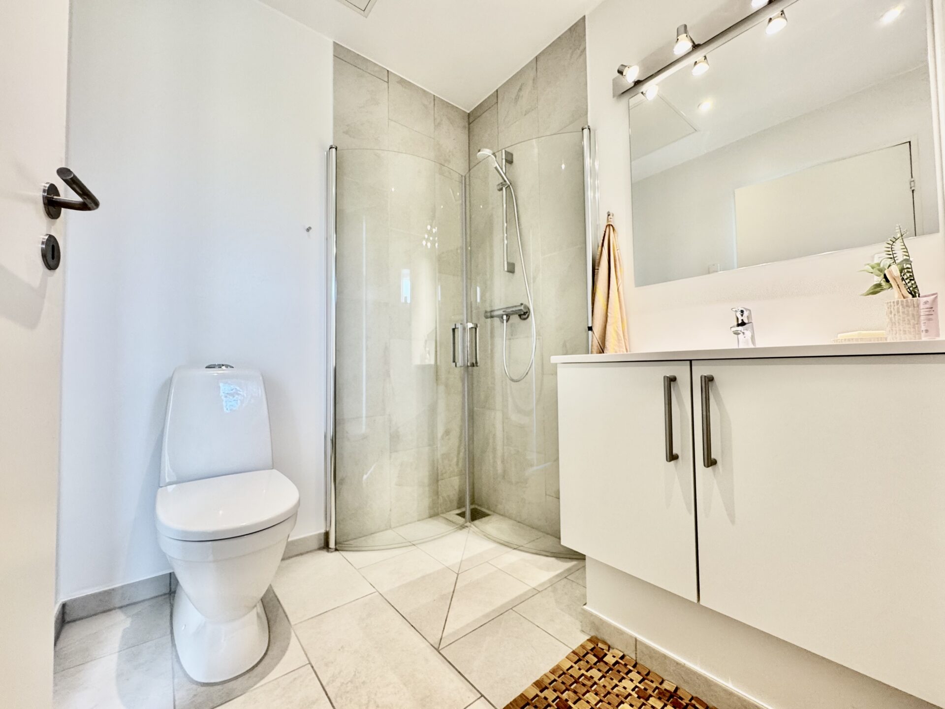 Du får et dejligt badeværelse med plads til installation af egen vaske- og tørremaskine.