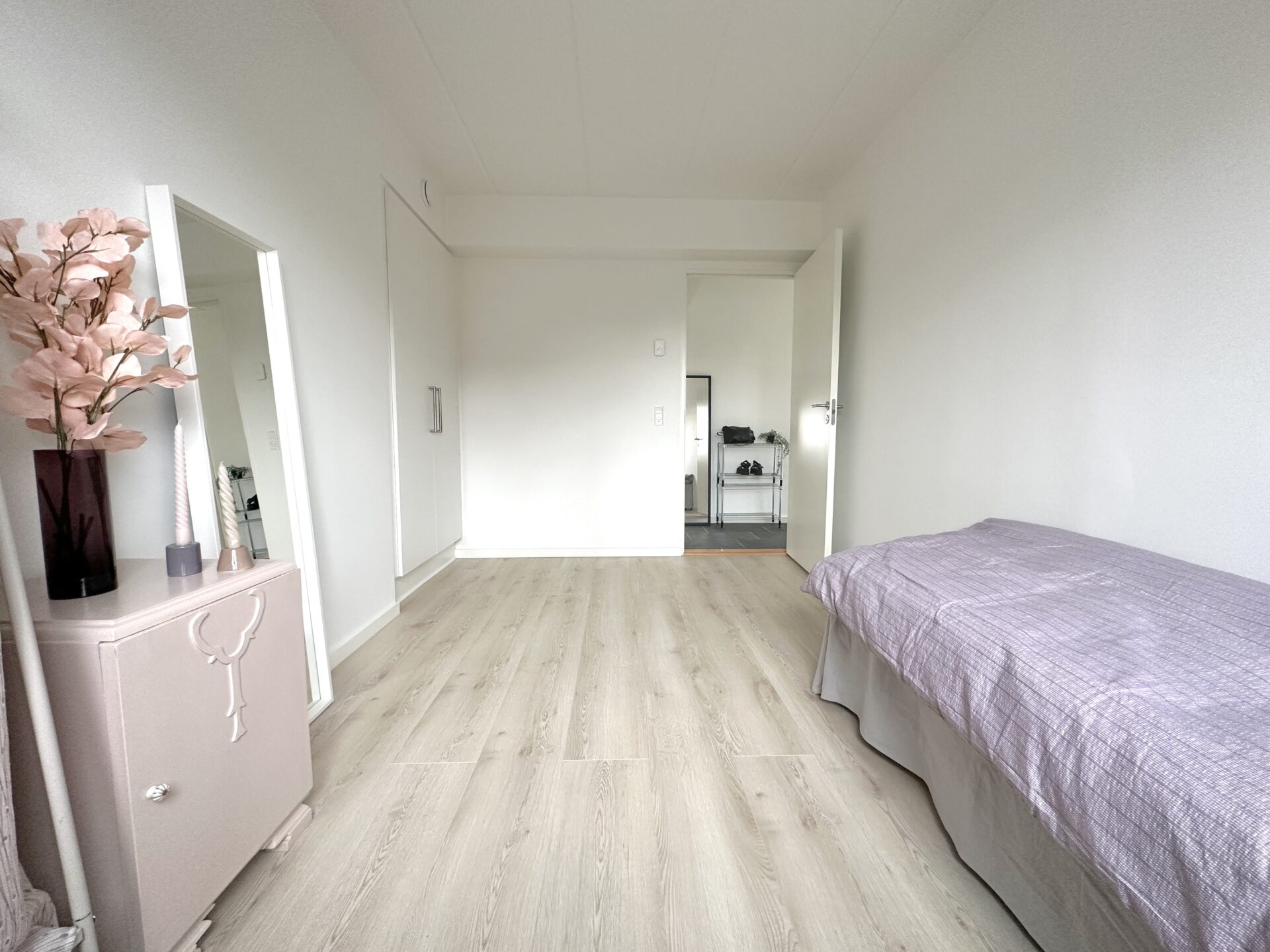 Vi er vilde med denne lejlighed fordi planløsningen er super god. Du får tre gode værelser alle med faste skabe. Soveværelset og husets ene af to badeværelser er i en afdeling for sig.