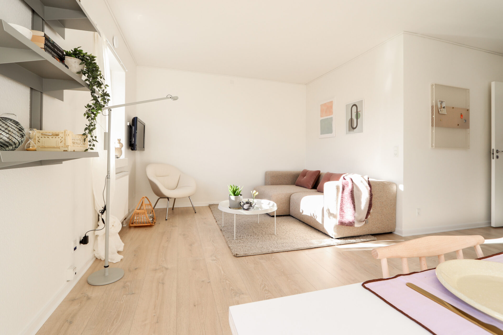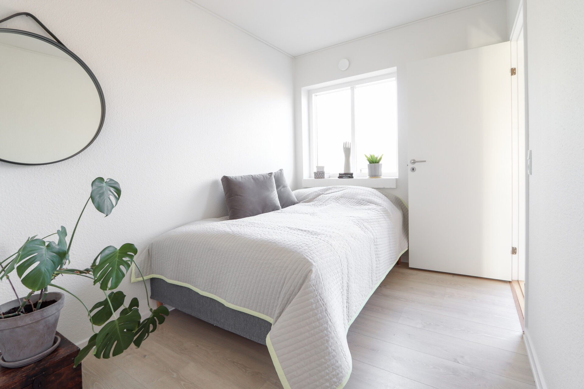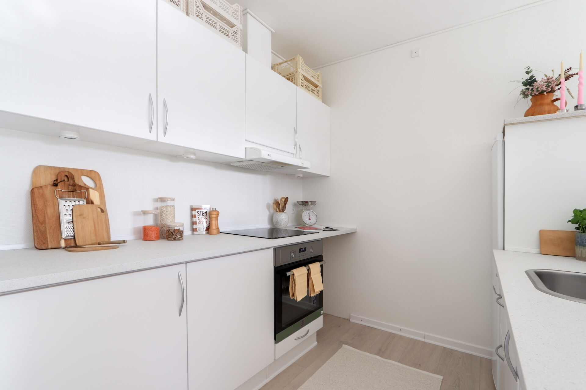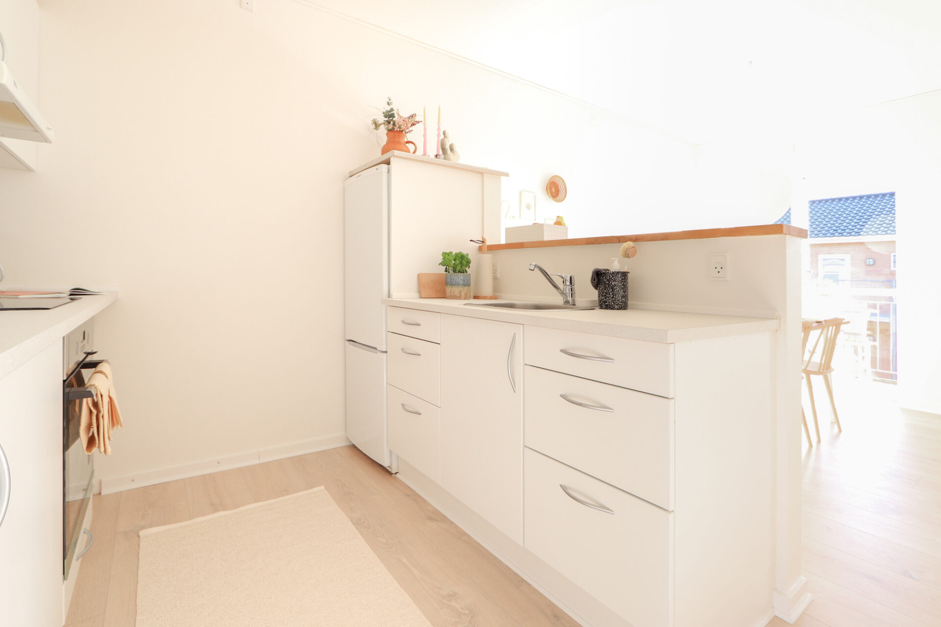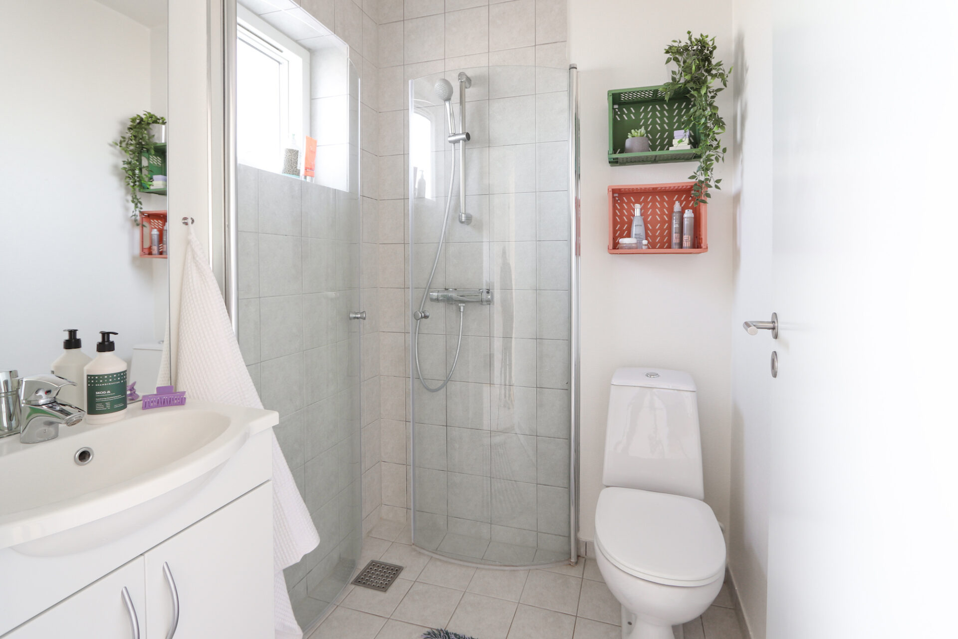 Du får det hele – et rigtigt køkken med plads, et godt værelse med garderobeskabe, og super badeværelse med fin bruseniche.