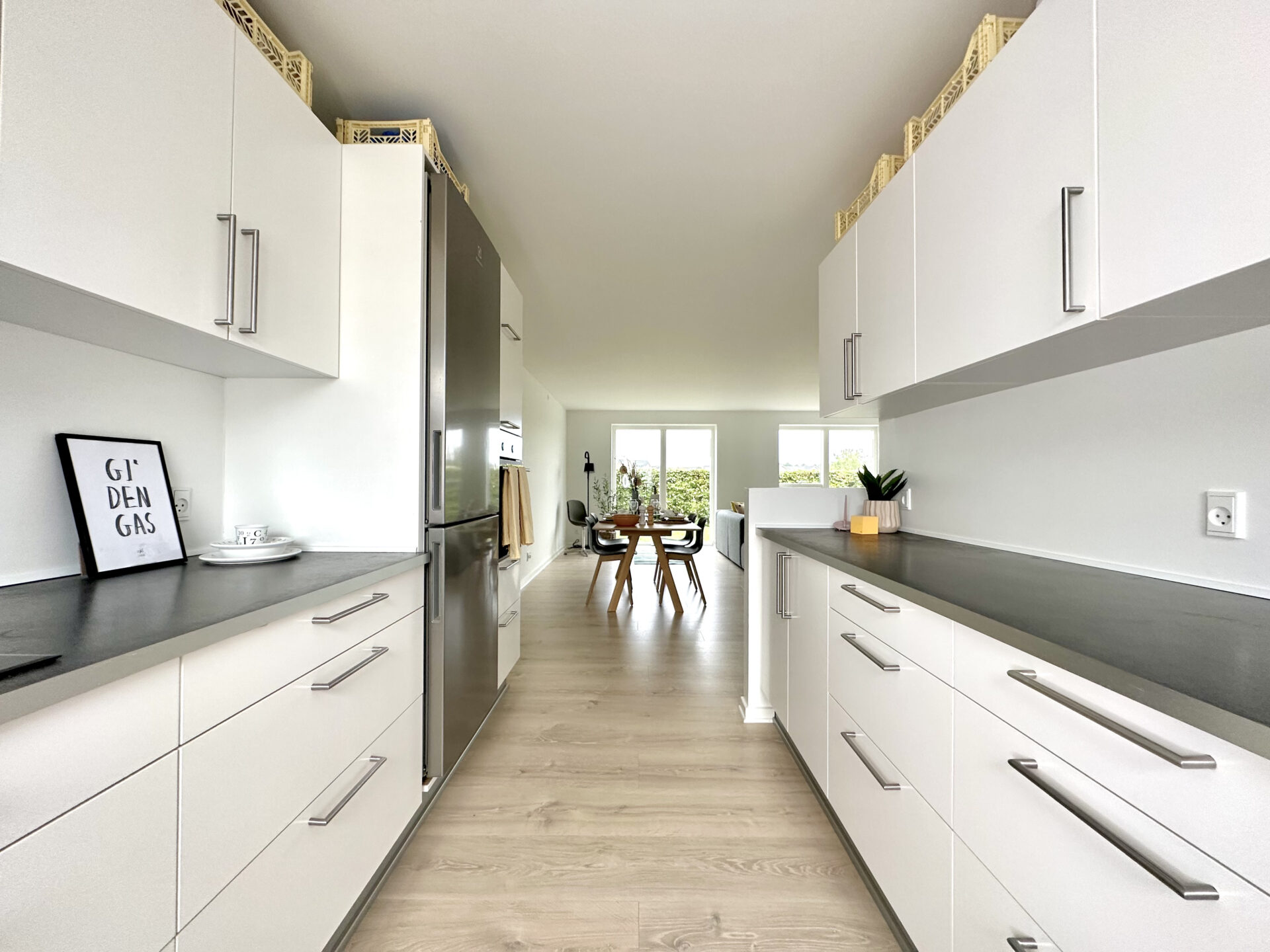 Køkkenet er nærmest som en balsal. Her får du virkelig meget bordplads samt opbevaring i skabe og skuffer.