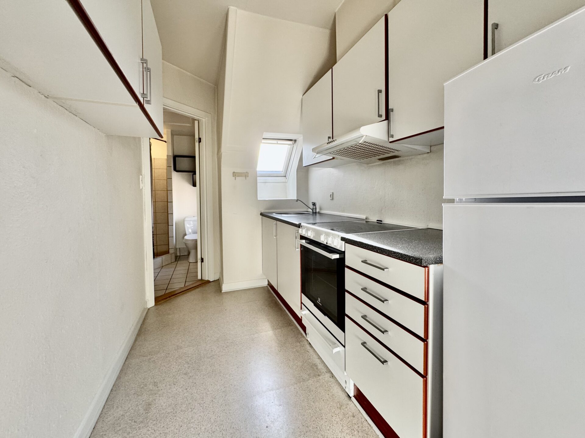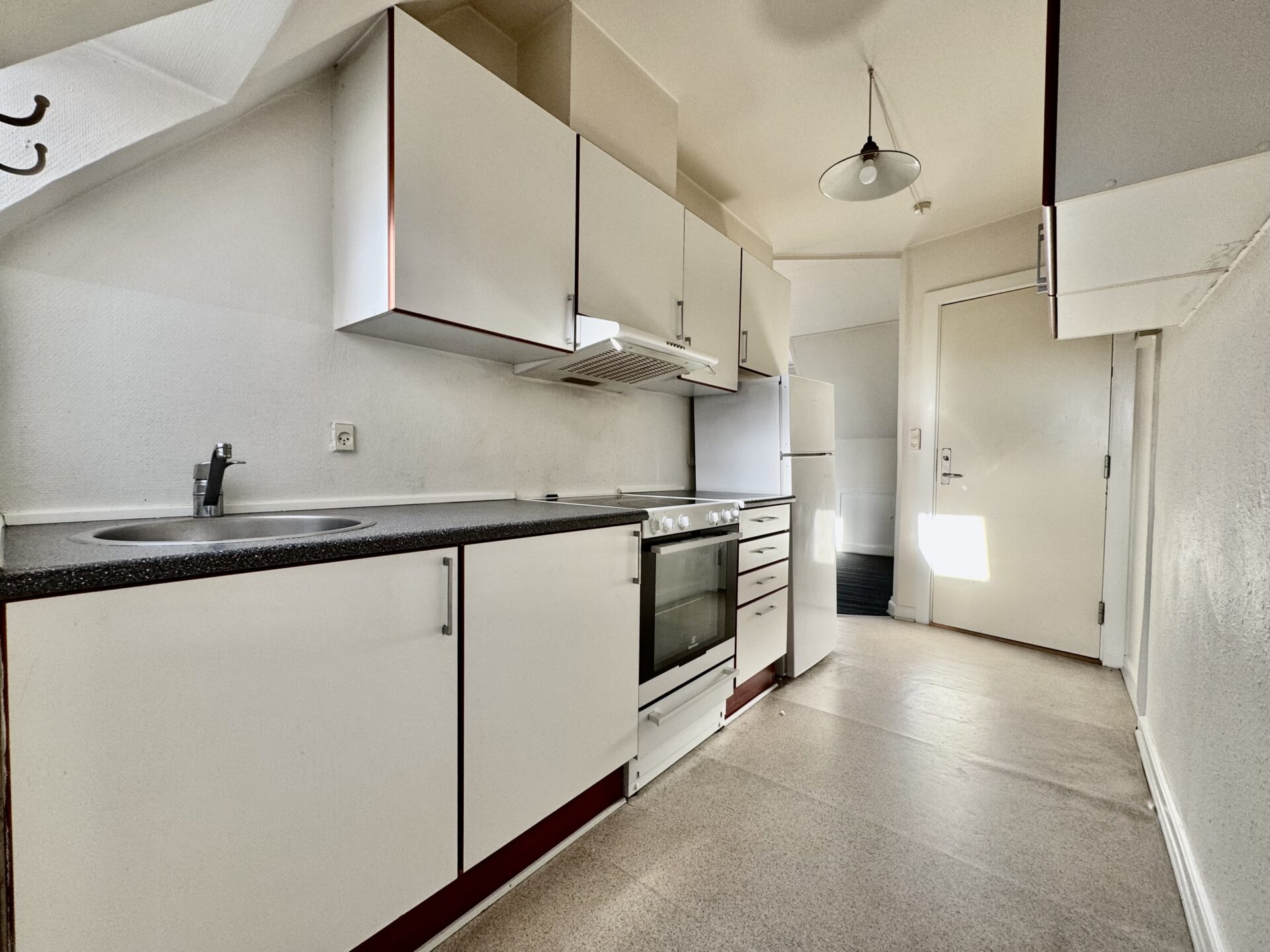 Lejligheden byder på en et funktionelt køkken med plads til madlavning og små hyggelige stunder.